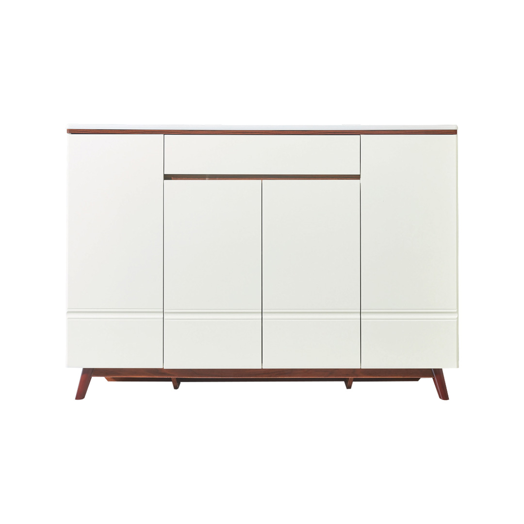 Elegant and practical shoe cabinet, designed to fit boots and larger shoes, with a convenient drawer for shoe accessories. Features a modern white-and-wood finish that adds style and warmth to any space.