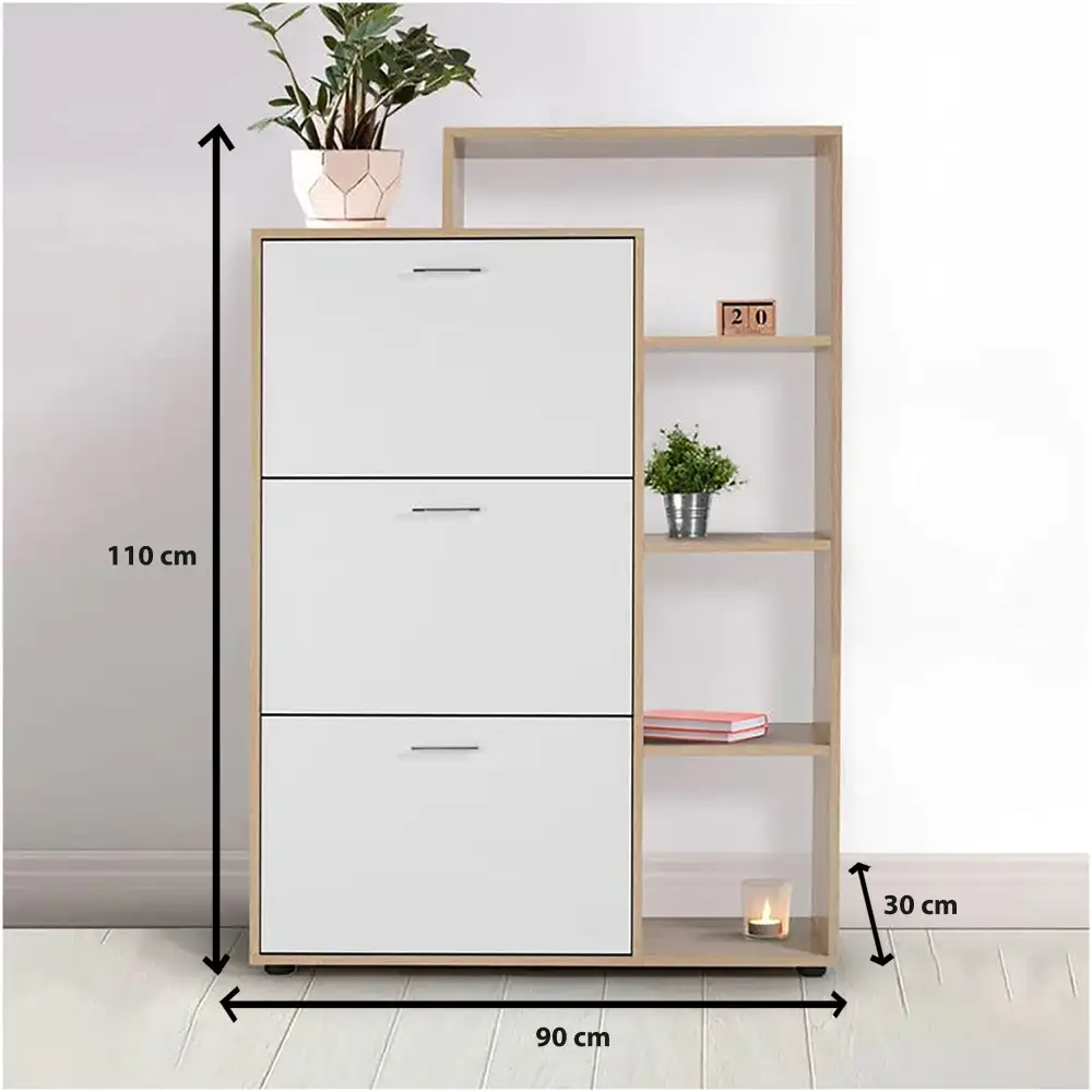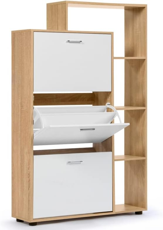 Stylish shoe cabinet made of durable MDF with a light wood and white finish.
